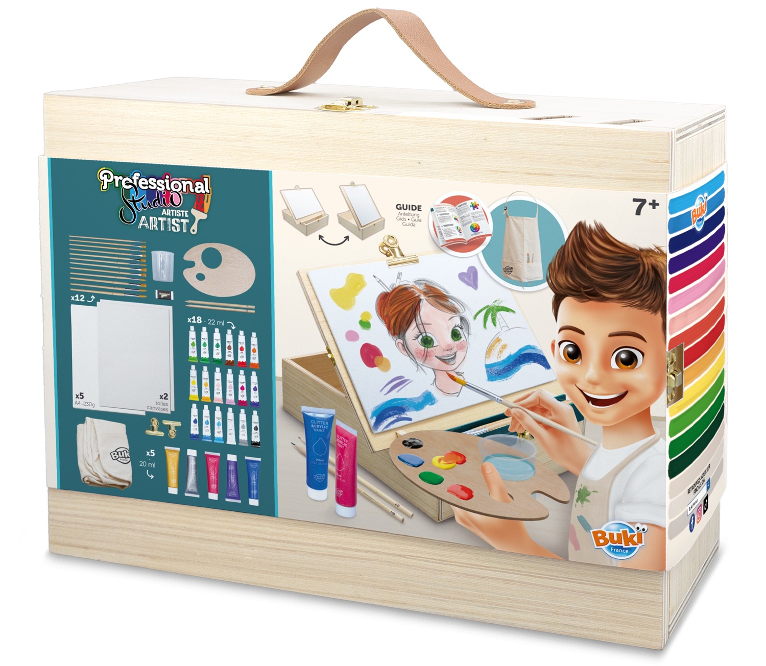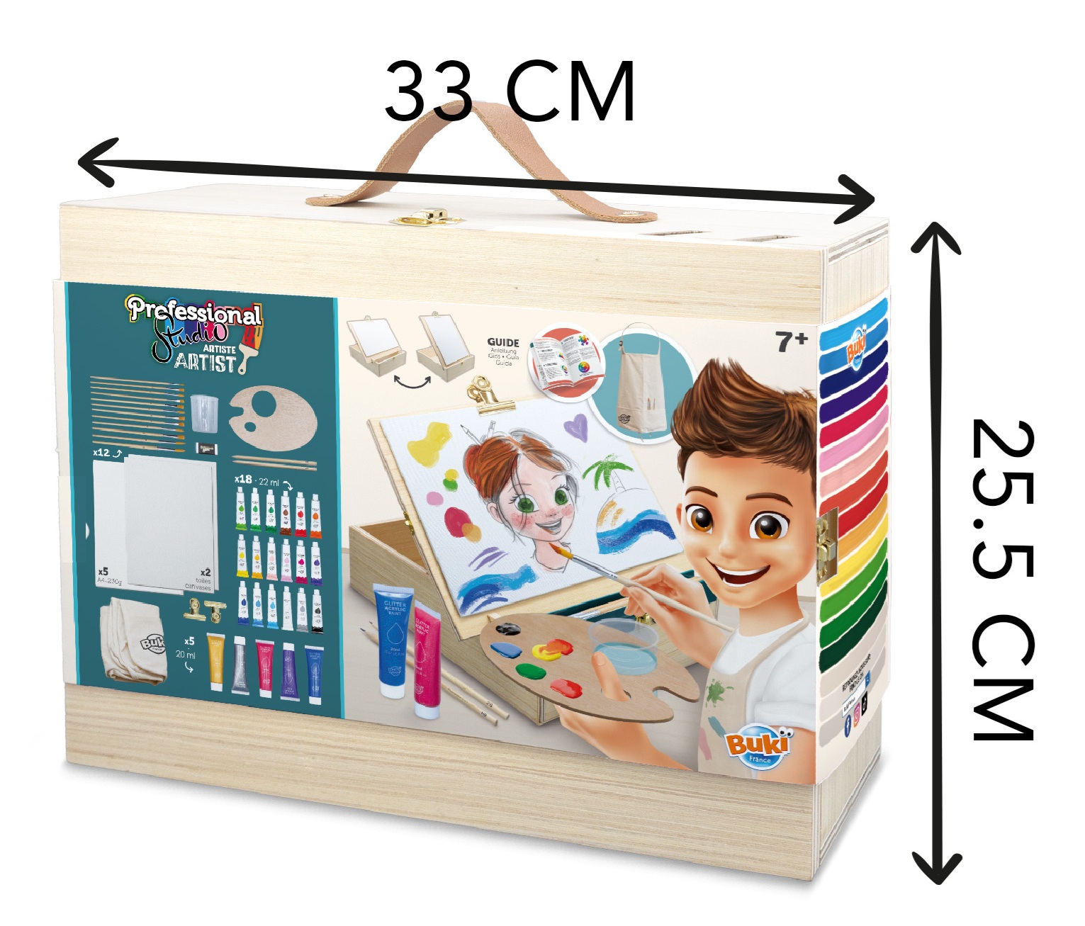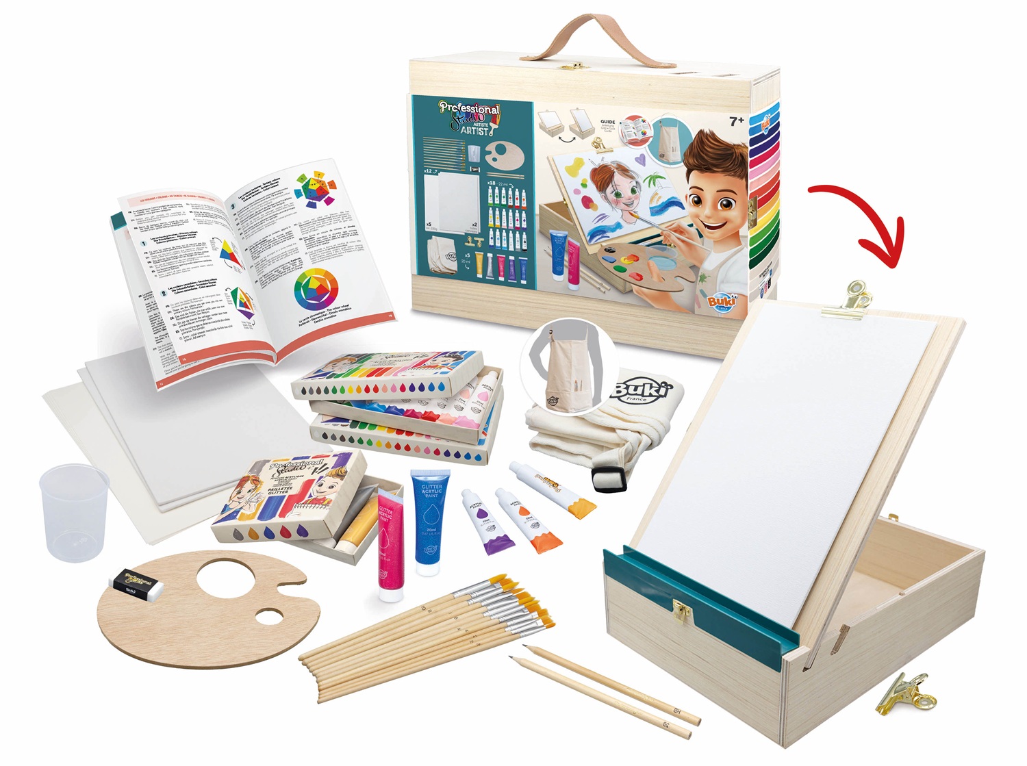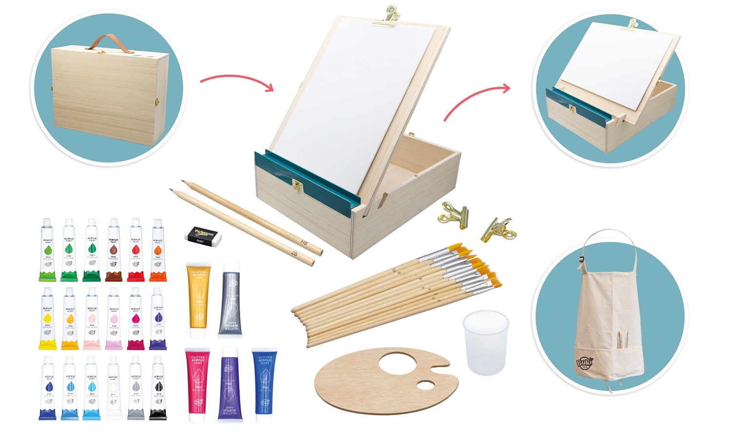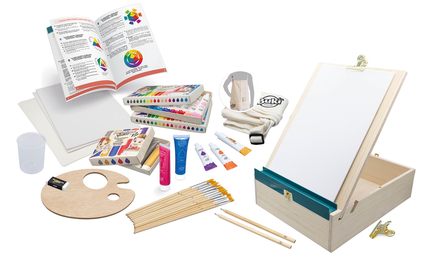 Drewniana walizka z akcesoriami zaprasza do świata kreatywności. Załóż fartuch, usiądź przy sztaludze i daj się ponieść wyobraźni. Zestaw artystyczny od BUKI zawiera wszystkie niezbędne akcesoria do tworzenia swoich unikatowych dzieł sztuki wraz z instrukcją dotyczącą różnych technik malarskich i mieszania kolorów.