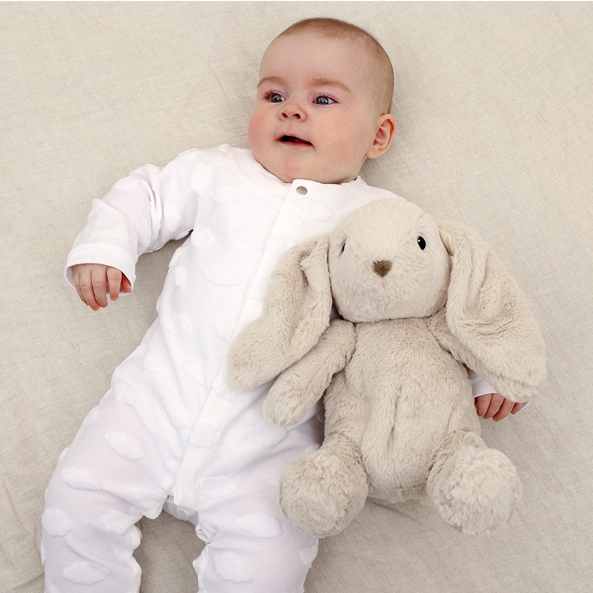 Miękka i urocza przytulanka królik posiada zapięcie na rzep, dzięki któremu z łatwością przymocujesz ulubionego towarzysza Twojego maluszka do łóżeczka, wózka lub fotelika samochodowego. A kiedy przytulanka potrzebuje kąpieli, wystarczy, że wyjmiesz panel dźwiękowy i wrzucisz maskotkę do prania.