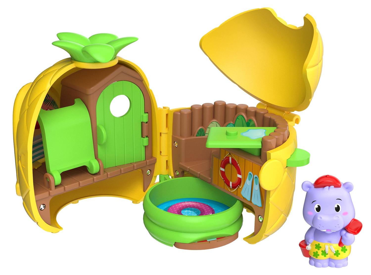 Zestaw Ananas Mini Domek z basenem zawiera: otwierany domek i 1 zwierzątko - hipopotama. Zabawka dla dzieci w wieku 18 miesięcy +.