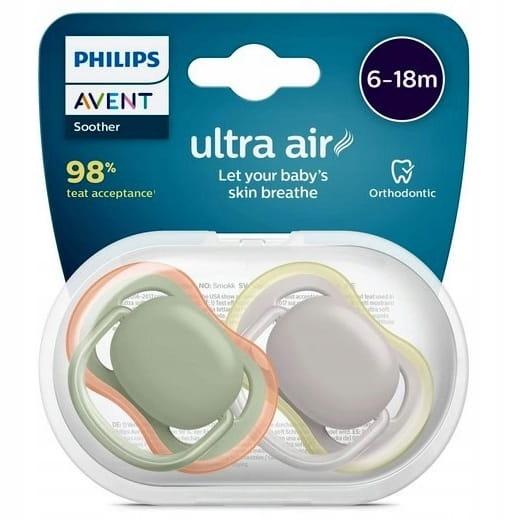 Smoczek Ultra Air został zaprojektowany z myślą o swobodnym przepływie powietrza, dzięki czemu skóra dziecka oddycha.