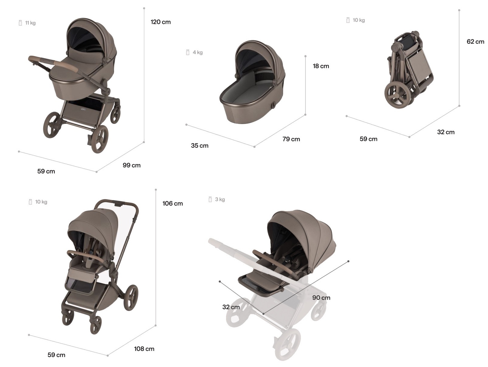 - Możliwość zamontowania na stelażu każdego wózka dziecięcego posiadającego funkcję wpinania fotelika 0-13 kg