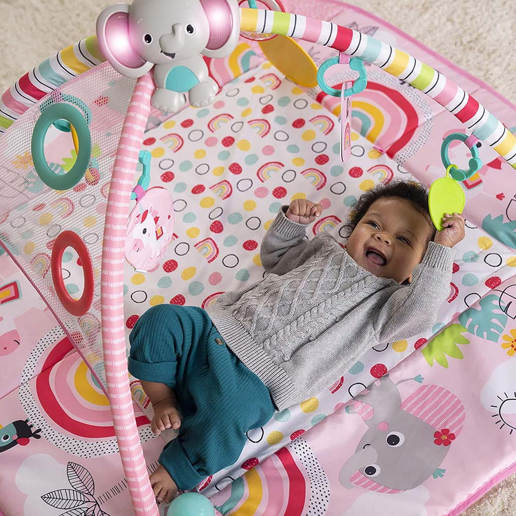 Wesoły słonik gra muzykę i włącza światełka, aby przyciągnąć i utrzymać uwagę dziecka. Pokochacie styl Tęczowych tropików z kolorowymi wzorami konfetti, jednorożcami i innymi atrakcjami.