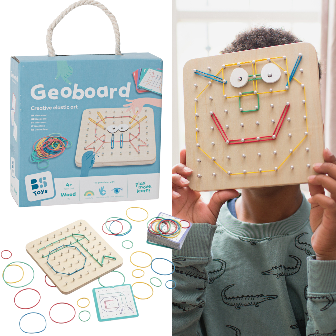 BS Toys Geoplan – tablica manipulacyjna z gumkami to kreatywna pomoc edukacyjna, która wprowadza dzieci w świat kształtów, symetrii i matematyki poprzez praktyczne działanie. Dzieci układają gumki na specjalnej planszy, tworząc figury geometryczne, wzory i obrazy zgodnie z kartami z zadaniami lub według własnej wyobraźni.