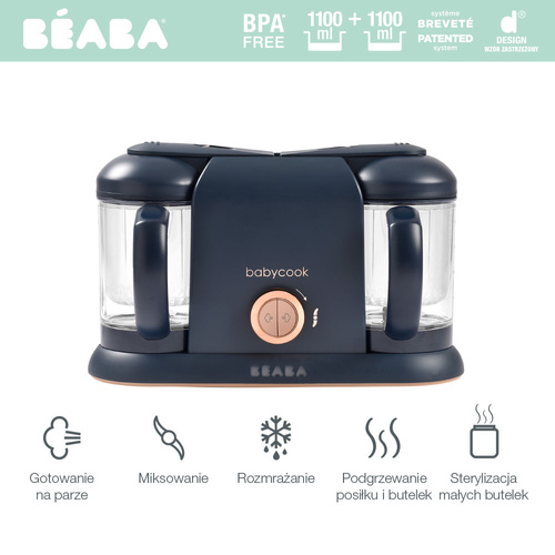 Wielofunkcyjne urządzenia do miksowania i gotowania na parze Babycook® francuskiej marki Beaba w wersji duo, czyli z dwoma dzbankami pozwoli przygotować pełny posiłek dla dziecka – od przystawek przez obiad do deseru – w niespełna 15 minut. Babycook® oferuje 6 funkcji w 1: gotuje na parze, miksuje, rozmraża, podgrzewa posiłki i butelki oraz sterylizuje małe butelki, a do tego jest cichy i łatwy w obsłudze.