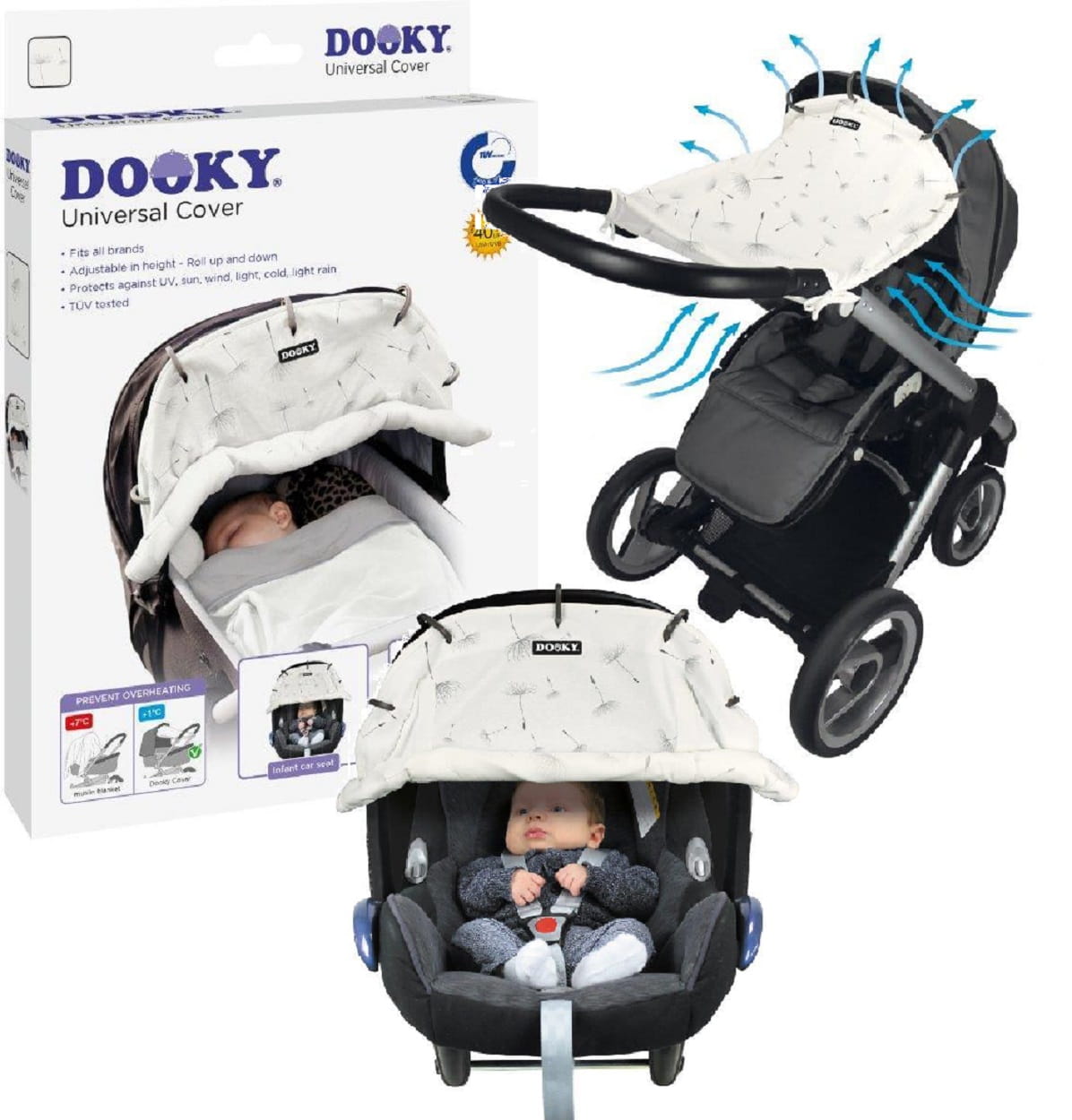 Dzięki uniwersalnej osłonce Dooky stworzysz spokojne i ciche środowisko dla swojego dziecka. Światło, wiatr, hałas, lekki deszcz i inne wpływy otoczenia są filtrowane. Osłonka Dooky jest uniwersalna i łatwo ją dopasować w kilka sekund do wózka, spacerówki, buggy i fotelika samochodowego 0+! Wykonana jest z wysokiej jakości, miękkiej, wygodnej bawełny z certyfikatem Oeko-Tex i można ją prać w pralce.