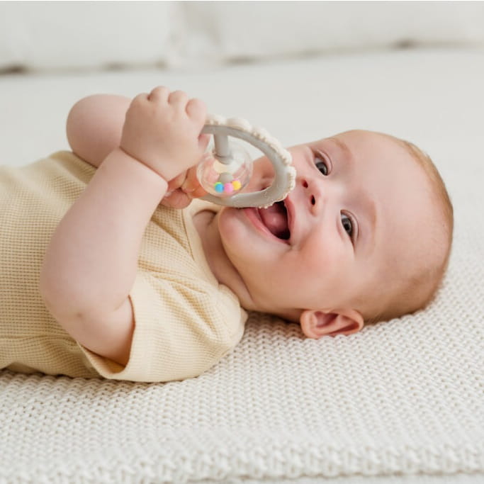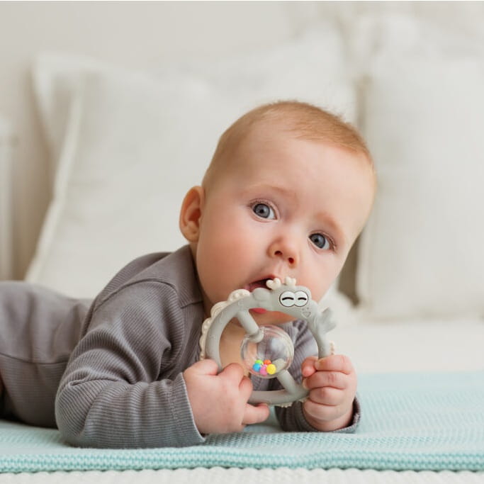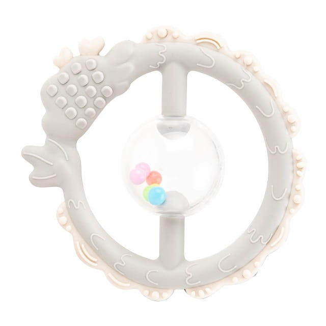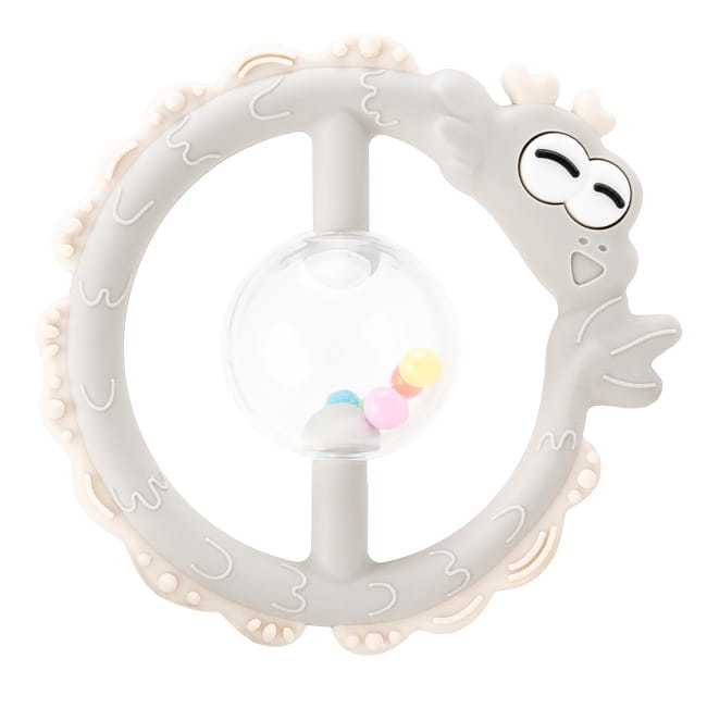 Smocza zabawka dla ząbkujących poszukiwaczy wrażeń łączy w sobie walory gryzaka i grzechotki! Całą powierzchnię obręczy zdobią zróżnicowane wypustki, które podczas gryzienia będą delikatnie masować dziąsełka malucha. Dostosowany do małych rączek kształt zabawki, ułatwi maluchowi jej chwytanie. Wewnątrz smoka znajduje się kula wypełniona kolorowymi kuleczkami, które grzechoczą przy potrząsaniu.