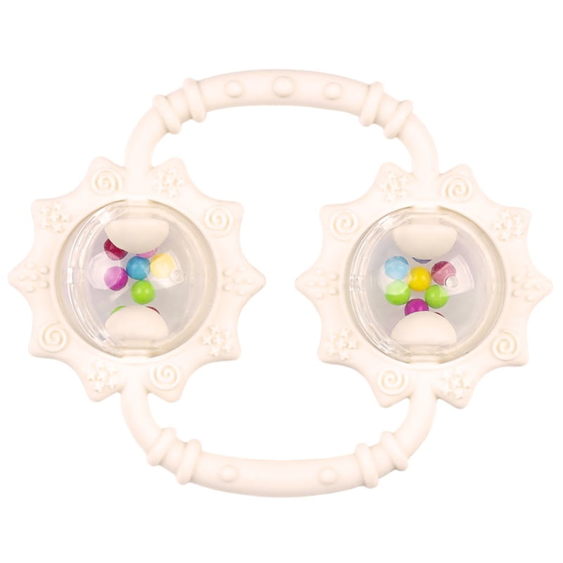Urocza zabaweczka ze zdwojonym walorem 2w1! Po pierwsze, posiada aż dwie kule wypełnione koralikami, po drugie, łączy w sobie funkcję grzechotki oraz gryzaka. Kolorowe koraliki, wydają wesoły dźwięk przy każdym potrząsaniu zabawką. Otaczają je miękkie obręcze w kształcie słoneczników, ozdobione wypustkami o zróżnicowanym kształcie. Dzięki temu, przy gryzieniu kwiatkowych płatków, wypustki będą masować obolałe dziąsła malucha, przynosząc mu ulgę. Wygodne uchwyty, łączące kwiatki, ułatwią małym rączkom trzymanie zabawki.