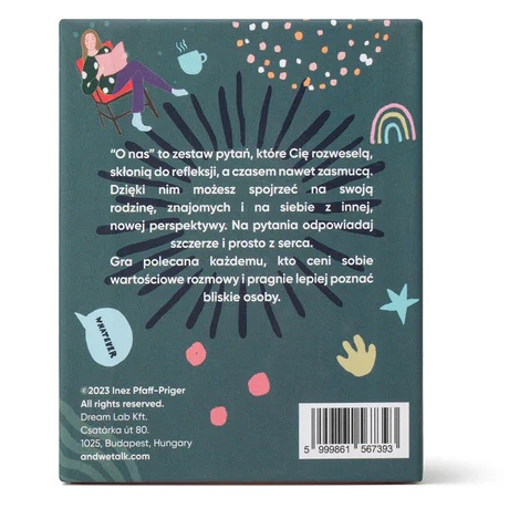 Przenieś wspólne rozmowy na nowy, wyższy poziom z O nas - to emocjonująca gra karciana, która służy do rozpoczęcia ważnych i znaczących rozmów. Zawiera 80 kart, które pozwolą Tobie i Twoim bliskim spojrzeć na relacje i siebie nawzajem z zupełnie nowej perspektywy. Daj się zainspirować!