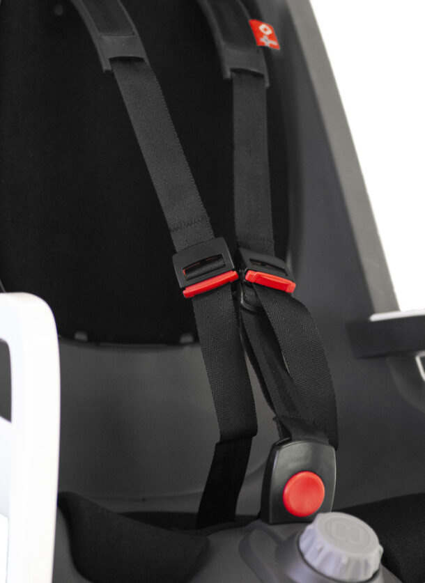 - Wgłębienie na kask zapobiegające wypchnięciu głowy dziecka do przodu.
