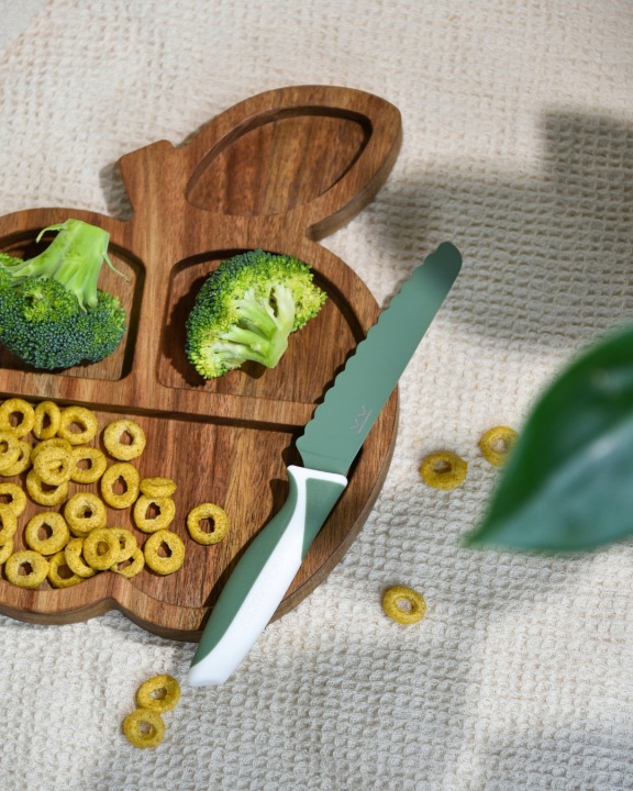 KiddiKutter to wyjątkowy nóż kuchenny zaprojektowany specjalnie z myślą o dzieciach. Kroi jedzenie – nie palce. Dzięki sprytnej, opatentowanej konstrukcji maluch może bezpiecznie kroić owoce, warzywa, mięso czy pieczywo i z dumą uczestniczyć w przygotowywaniu posiłków.