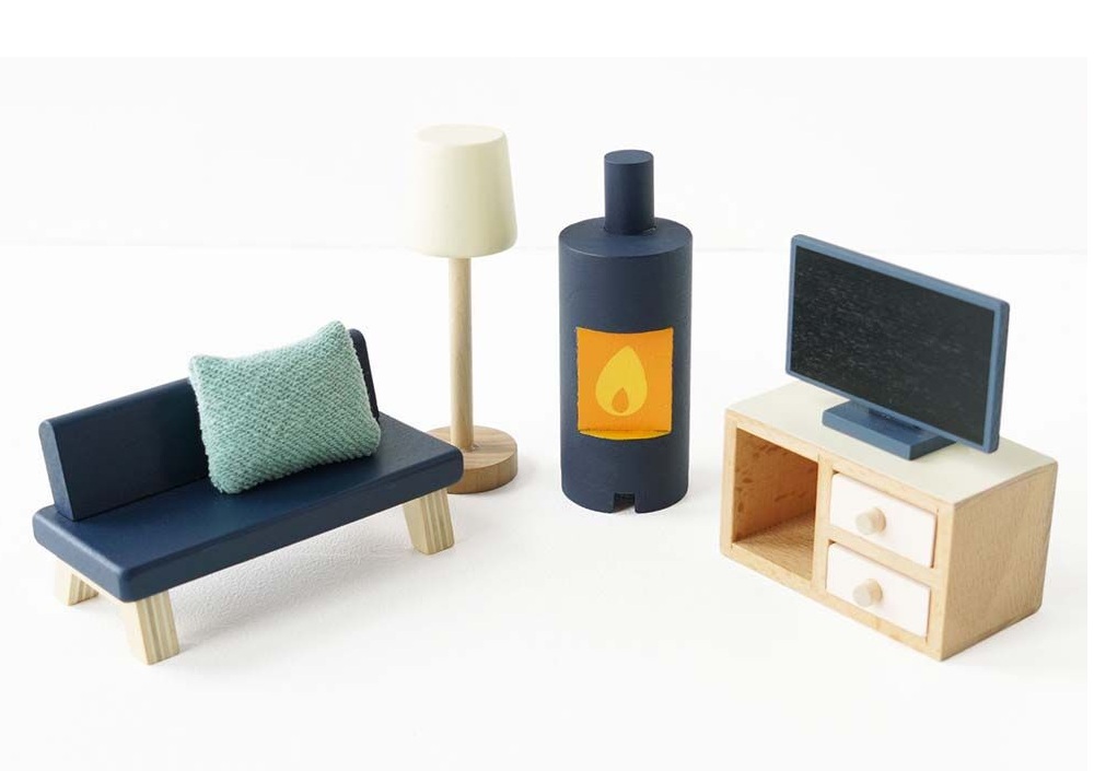 Zabawka składa się z 35 uroczych mebli i akcesoriów, które kompleksowo wyposażą kuchnię, salon, sypialnię, łazienkę, oraz jadalnię domku dla lalek. Jest kominek, łóżka, stół, komoda, krzesła, kanapa, szafka rtv, telewizor, lampa stojąca, prysznic, toaleta, kuchenka, lodówka oraz różne dekoracje i wszystko idealnie pasuje do innych mebli i domków dla lalek marki Le Toy Van.