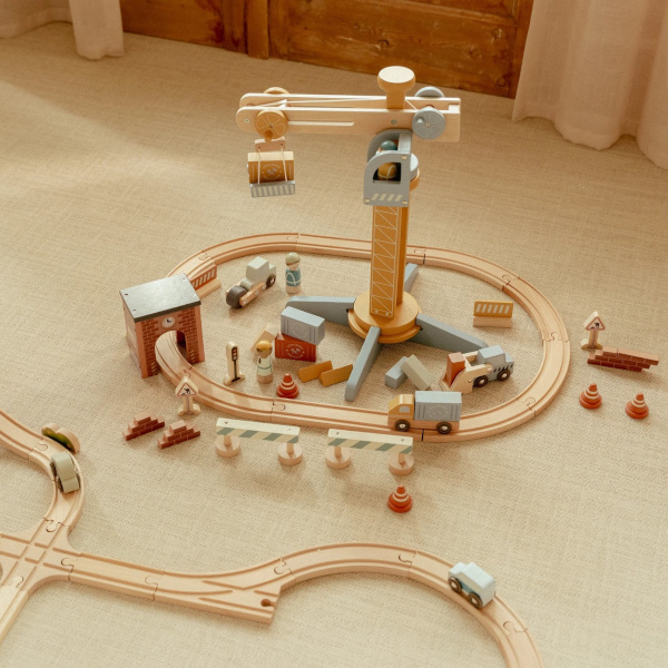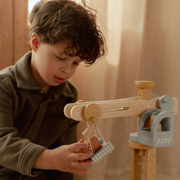 Zbudujmy wspólnie coś fajnego! Drewniany dźwig od Little Dutch to super pomysł na ciekawą zabawę. Pracownik dźwigu sprawnie załaduje na podnośnik ciężki sprzęt i przeniesie go w dowolnie wybrane miejsce. Zestaw zawiera figurki robotników, pojazdy, materiały budowlane. Jest kompatybilny z zestawem kolejki XL 100 elementów Little Dutch.
