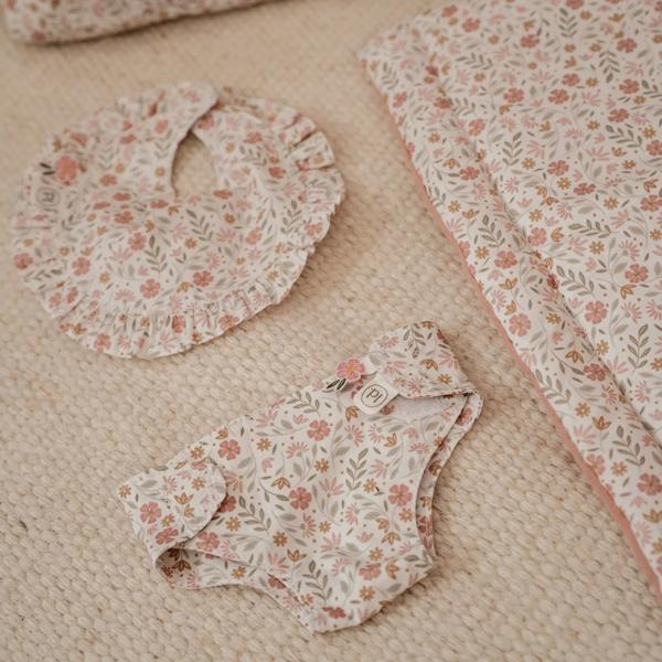 Praktyczny zestaw akcesoriów – w komplecie znajduje się torba, przewijak, pieluszka oraz apaszka w uroczym wzorze Soft Flowers.
