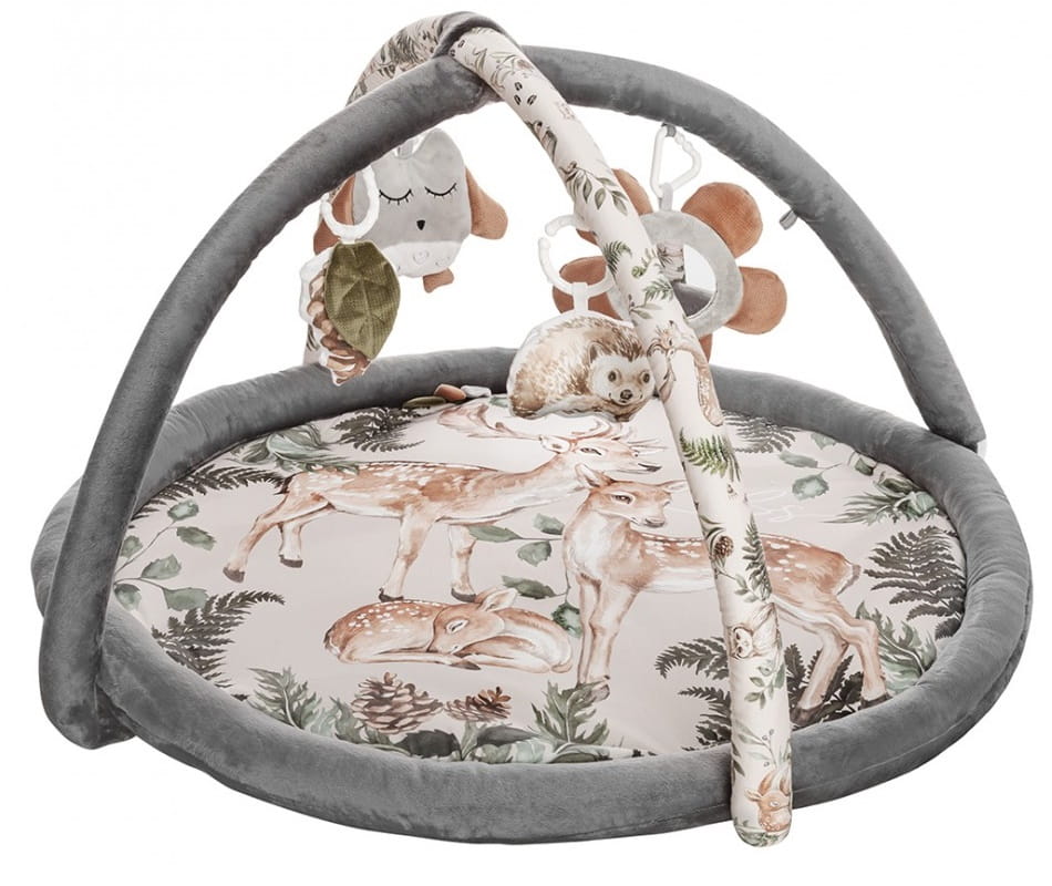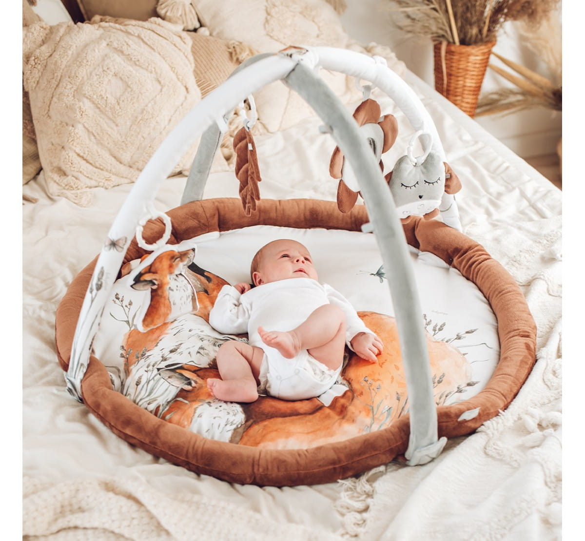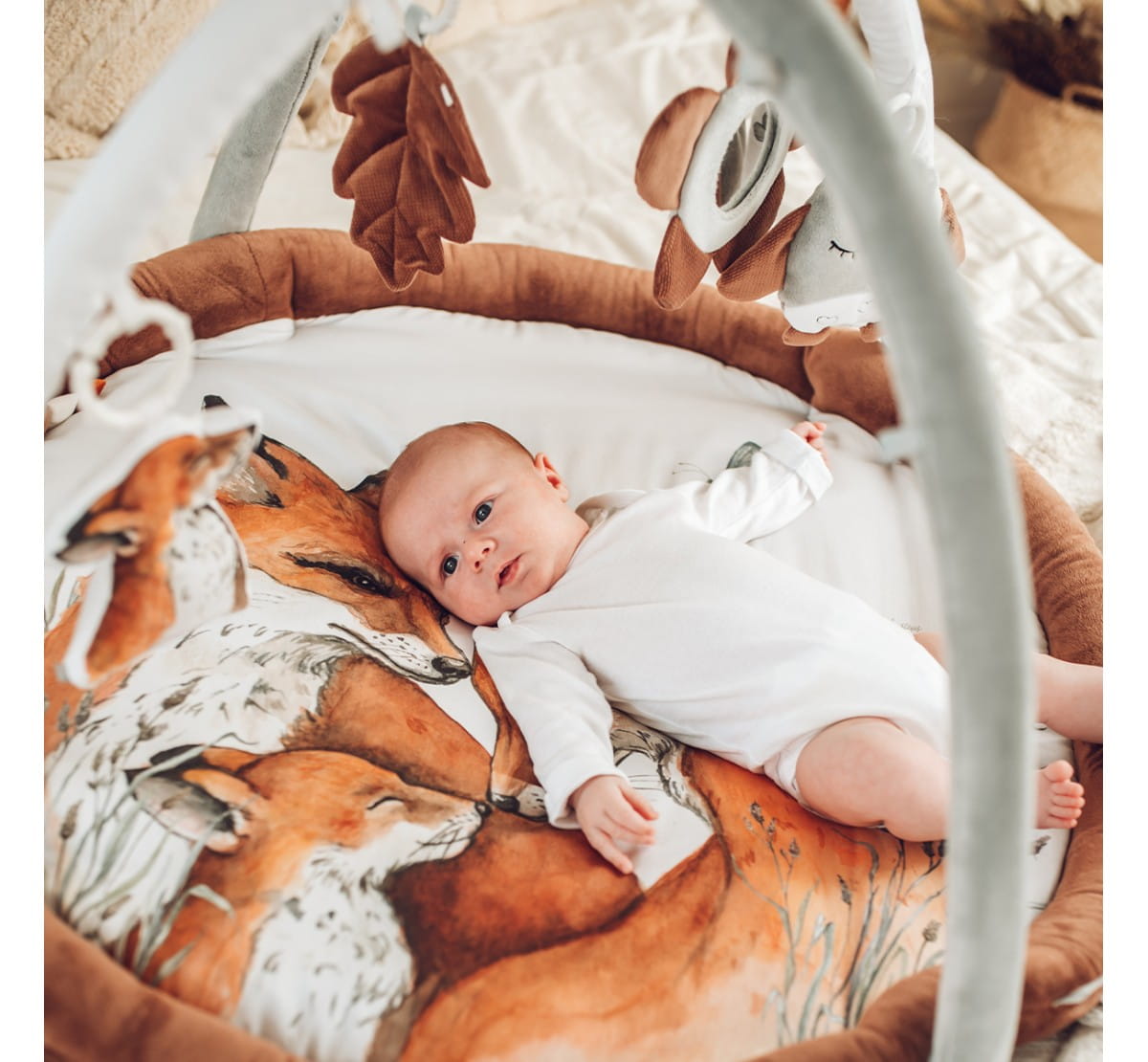 Kolorowa, piękna mata edukacyjna z zestawem zabawek sensorycznych o różnych kształtach firmy BabySteps. Poprzez zabawę wspomaga rozwój zmysłów – wzroku, słuchu i dotyku. Jednocześnie wspiera zwiększanie zdolności manualnych i motorycznych, zachęcając dziecko do gimnastyki i chwytania wiszących zabawek.