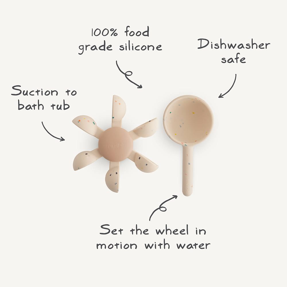 Przyciągnij uwagę maluchów zabawką do kąpieli Water Wheel firmy Mushie.