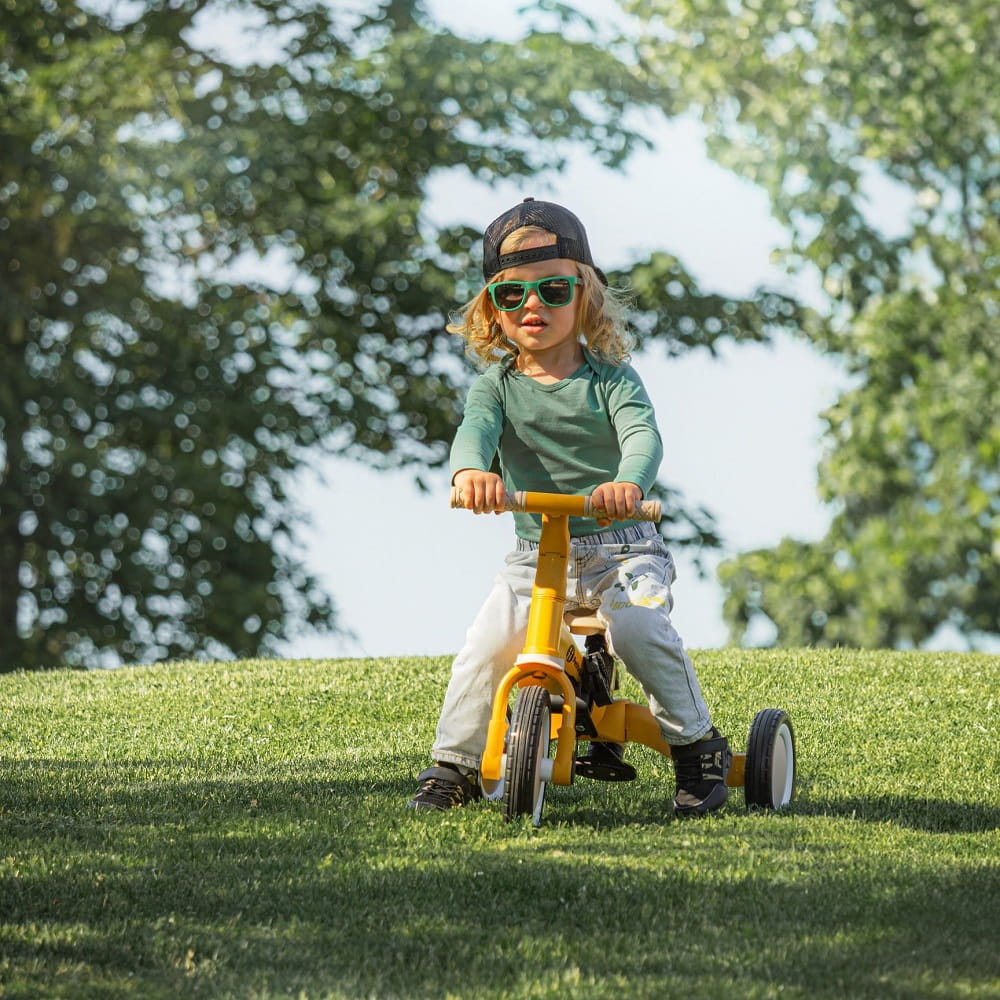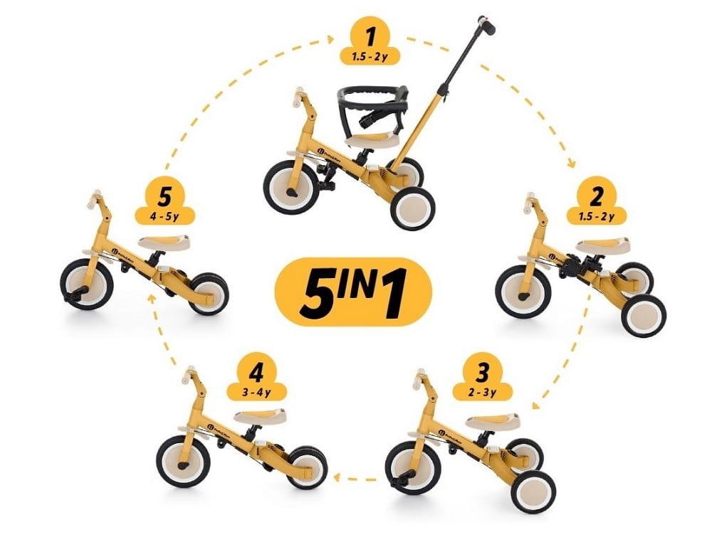 Wielofunkcyjny rowerek trójkołowy przeznaczony dla dzieci od 1,5 do 5 roku życia lub do 25 kilogramów. To nie tylko pojazd, służący do przemieszczania się i do nauki balansowania, ale także towarzysz rosnącego dziecka podczas wielu etapów rozwoju. Przemyślana transformacja rowerka dopasowuje się do potrzeb malucha w miarę wzrostu jego zdolności motorycznych. Początkowo to rowerek trójkołowy z możliwością asystowania przez rodzica, natomiast końcowa wersja to standardowy rowerek z pedałami, bez żadnych dodatkowych wspierających elementów. Dzięki takim zmianom w produkcie można wspomóc dziecko w etapach nauki jazdy na dwóch kołach.