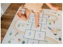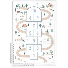 - mata do zabawy - duża, dwustronna powierzchnia: z jednej strony kolorowy wzór gry w klasy, z drugiej - spokojny, stylowy motyw pasujący do każdego wnętrza.