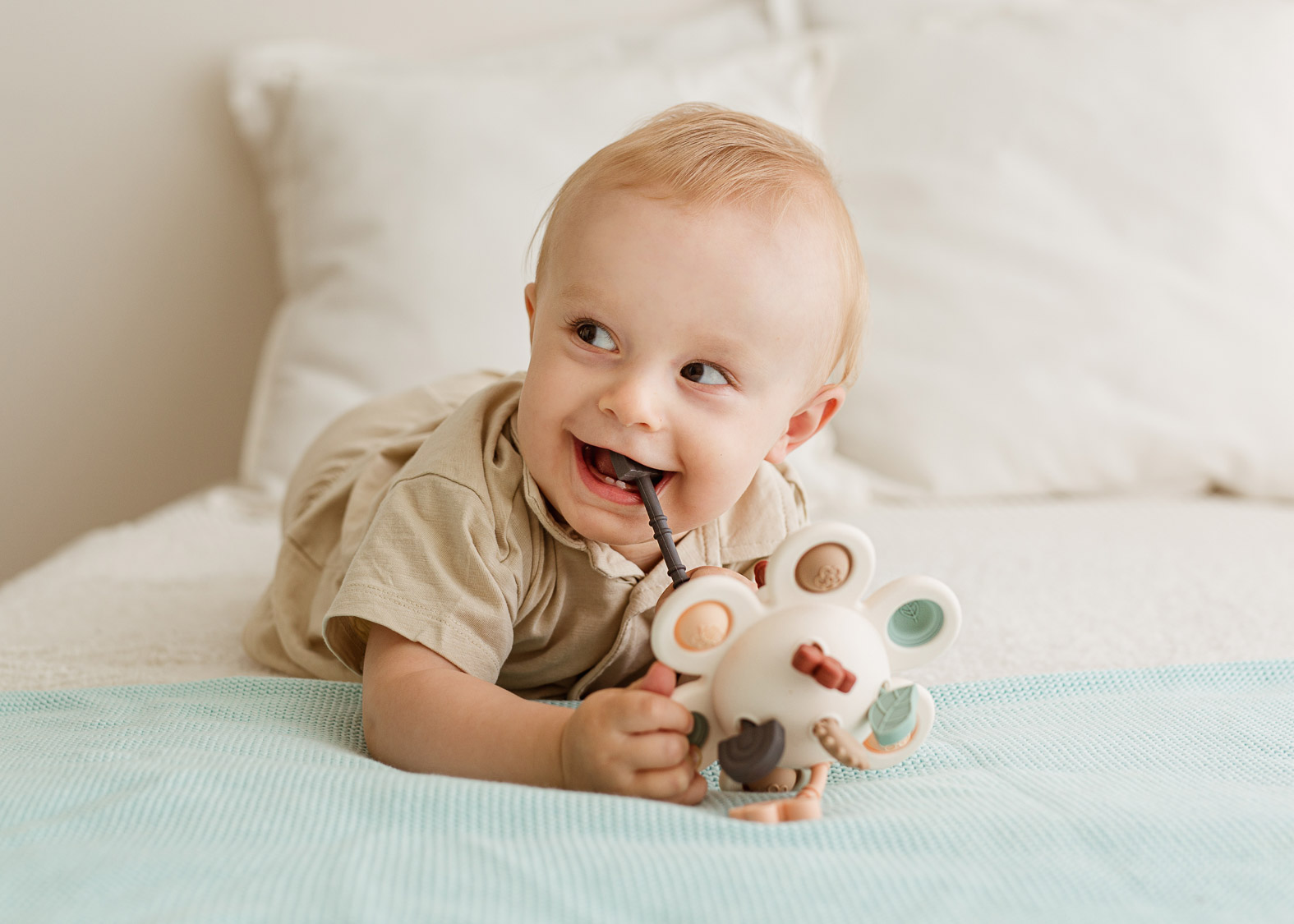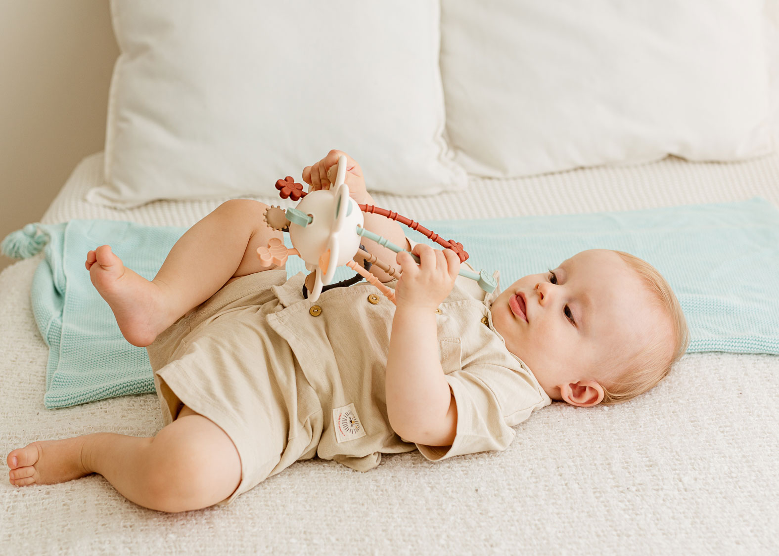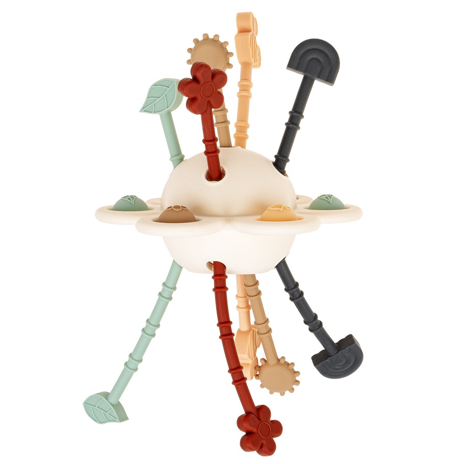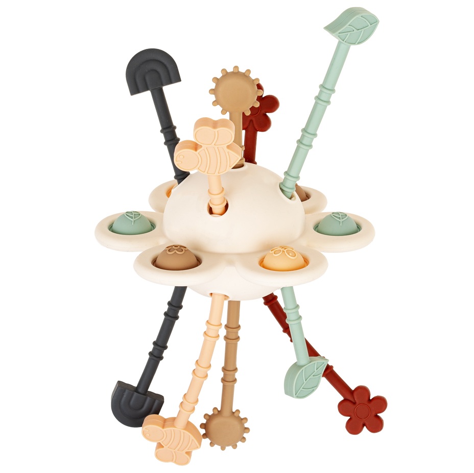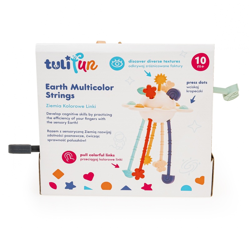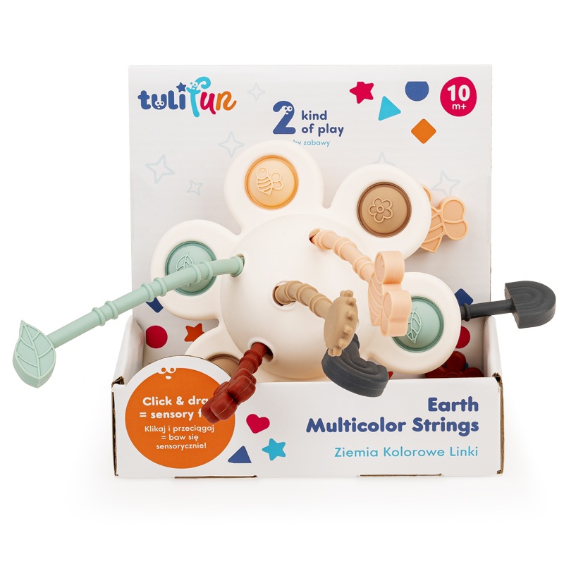 Małe co niego dla miłośników przyrody! Ta stylowa zabawka w pięknych kolorach ziemi zapewni moc sensorycznej zabawy. Znajdziemy tu kilka kuleczek do wciskania i wyciskania z powrotem na górę oraz pięć kolorowych linek do przeciągania. Każdą z nich zdobią wypustki i urocze kształty.