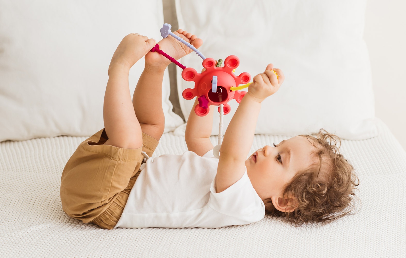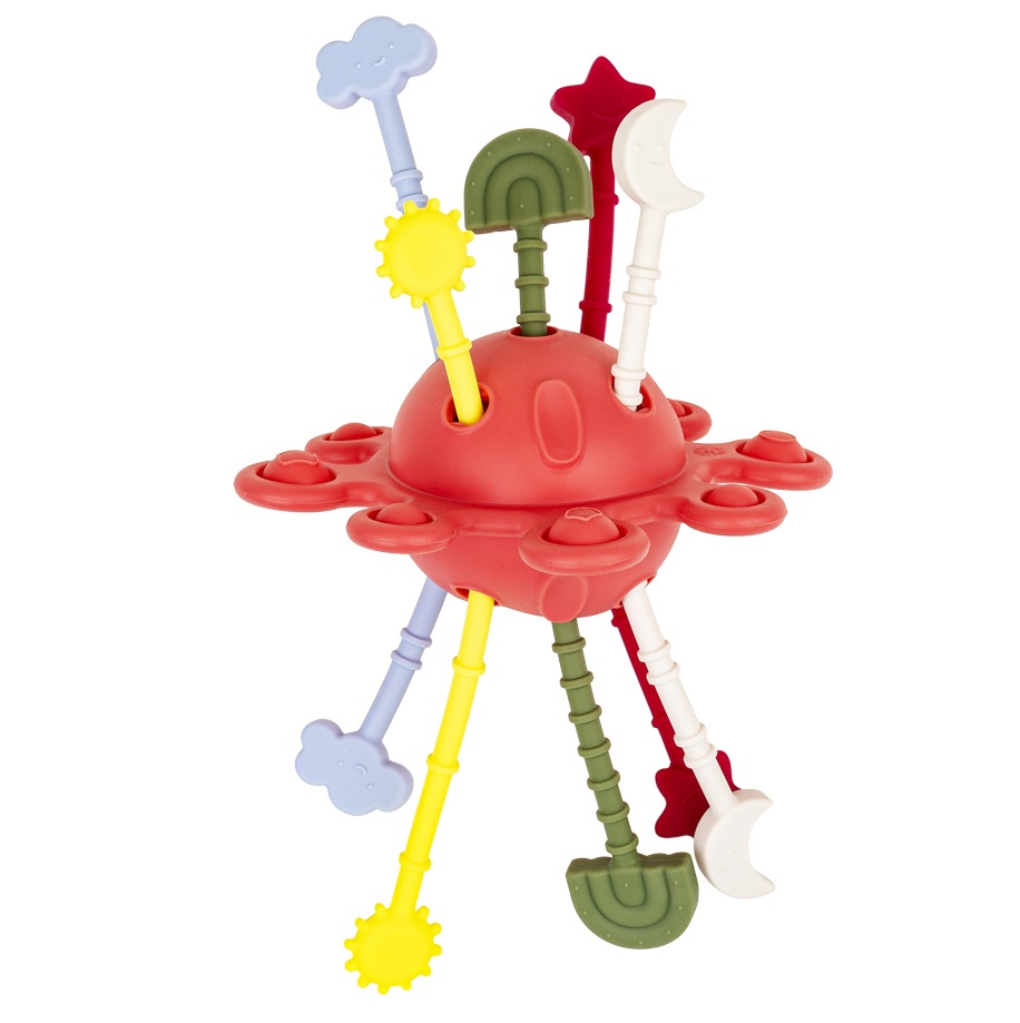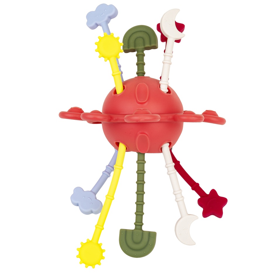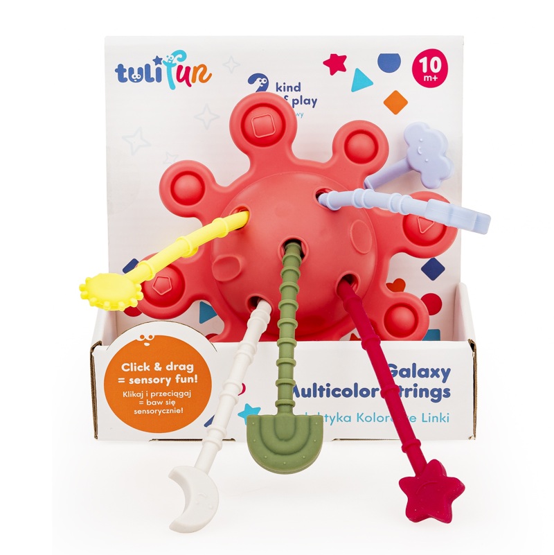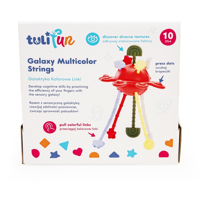 Hej, maluszku, pora na kosmiczną przygodę! Galaktyka to mięciutka zabawka wyposażona w kuleczki do wciskania. Czynność ta pomaga maluchom ćwiczyć precyzję i sprawność paluszków. Jakby tego było mało, na miłośników odlotowej zabawy, czekają tu też kolorowe linki do przeciągania, a każda z nich zakończona jest innym kształtem.