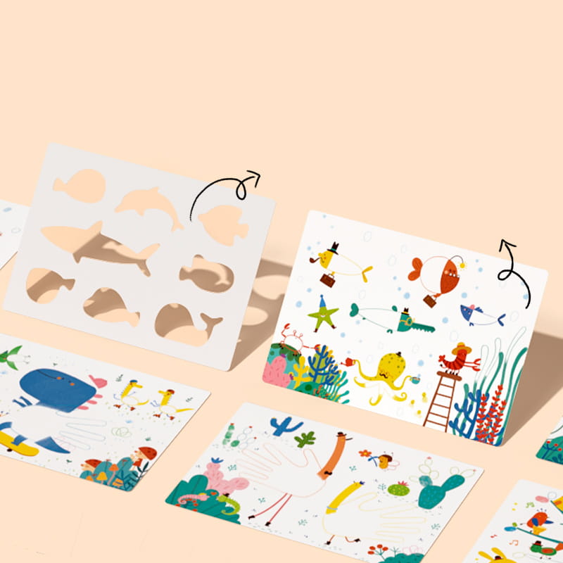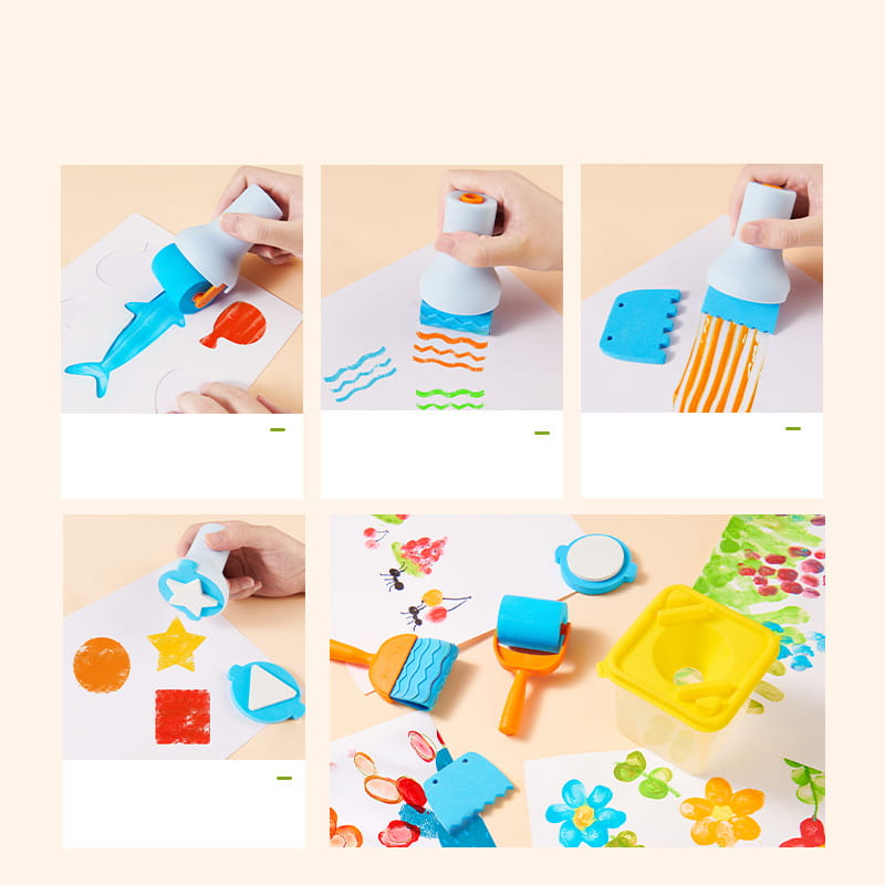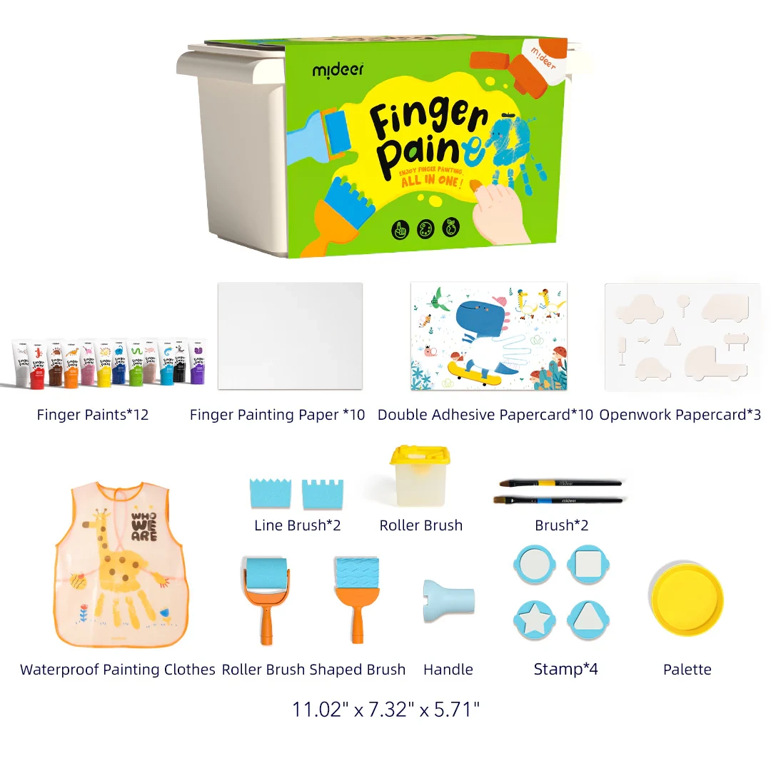 - Zawiera: 3 ażurowe kartki papieru, 10 dwustronnie klejących kartek papieru, 12 farb do malowania palcami, 2 pędzlowane, 10 papierów do malowania palcami, 1 tubkę pędzla, 1 paletę, wodoodporną ściereczkę do malowania, 1 pędzel wałkowy, 1 pędzel kształtowy, 2 pędzle liniowe, 1 uchwyt, 4 stemple